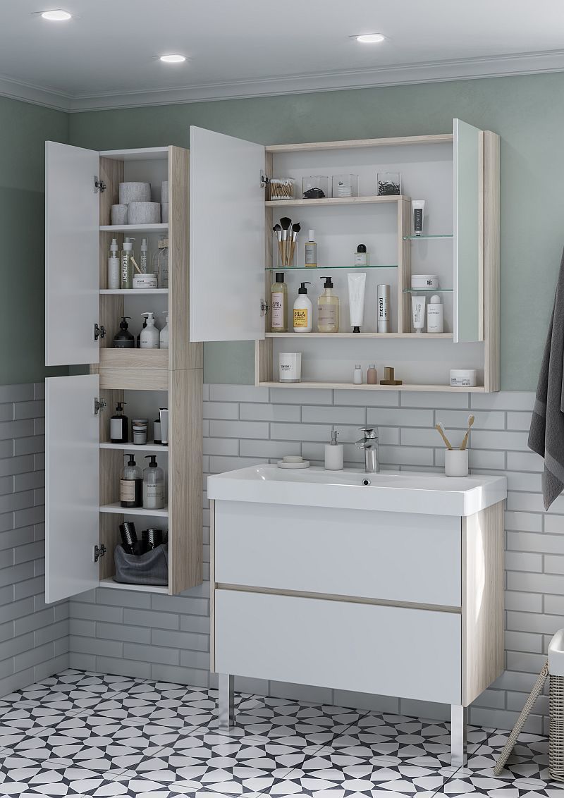 Зеркало-шкаф Акватон Сканди 85 см 1A252302SDB20, 4 петли с плавным доводом, 3 регулируемые стеклянные полки, цвет - белый глянцевый/дуб верона.