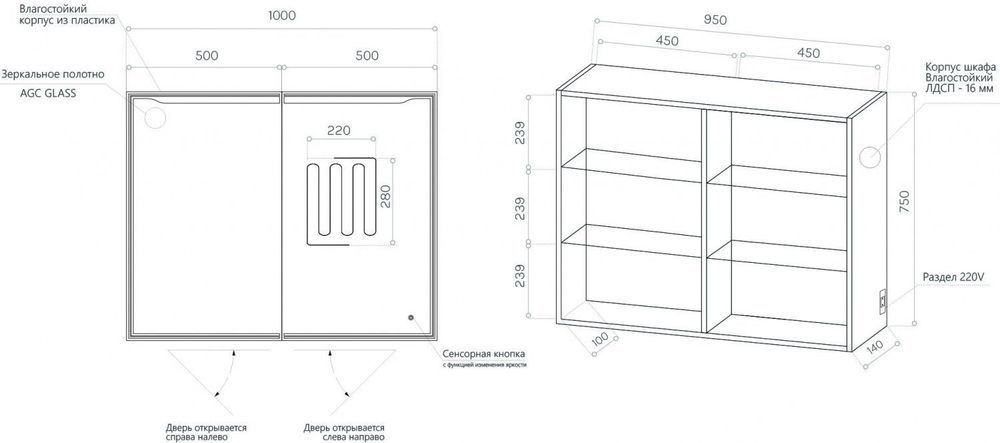 • Оснащение: зеркало-шкаф, провод с вилкой 1 м, розетка, навес, коробка, инструкция