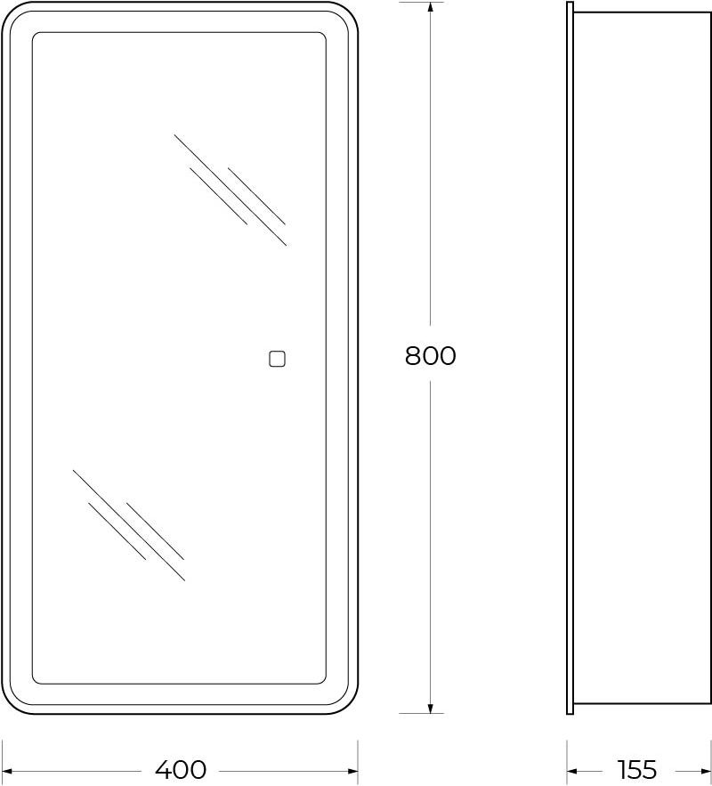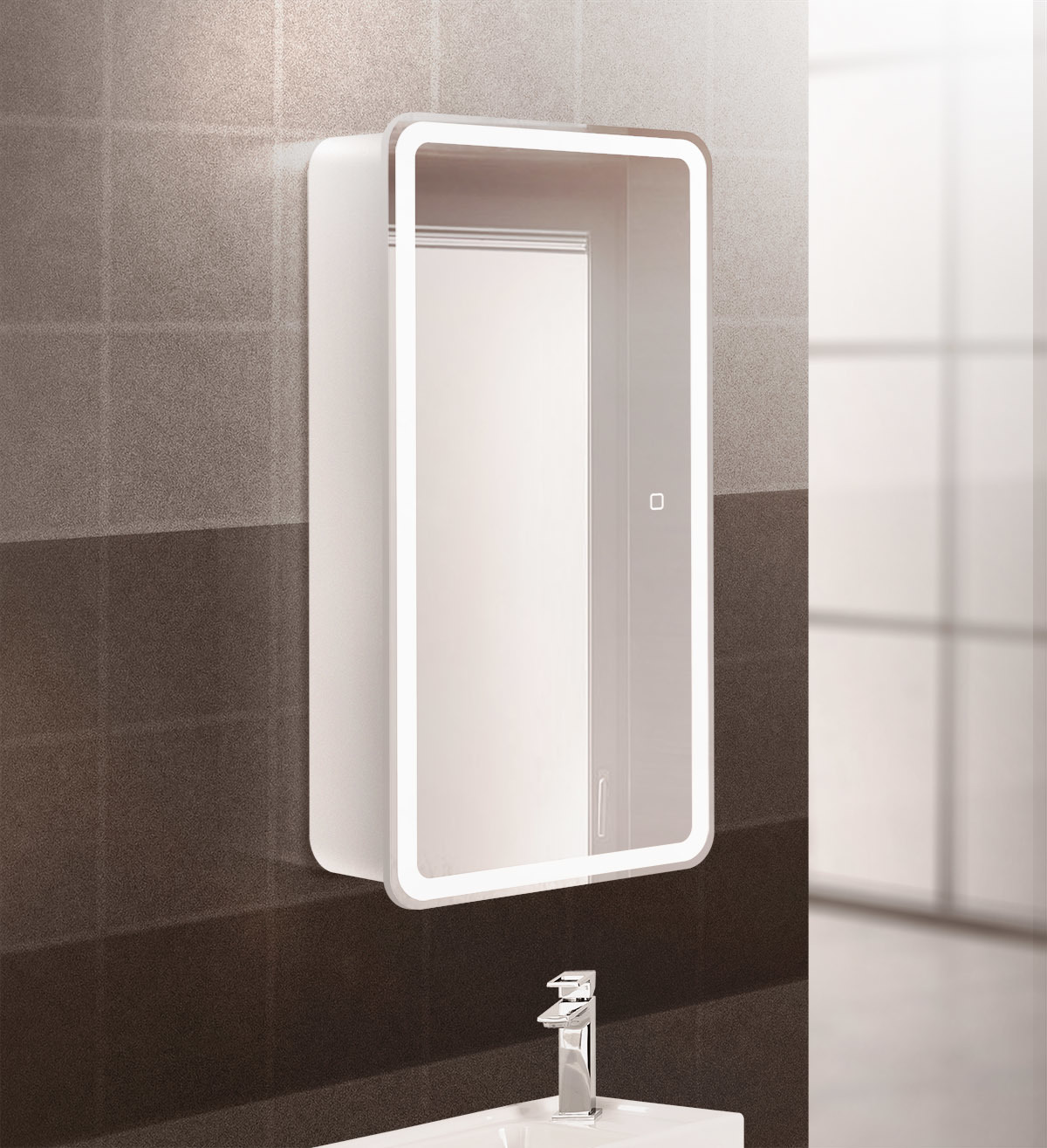 • Дополнительная информация: зеркальный шкаф оснащен встроенной подсветкой по периметру и сенсорным выключателем