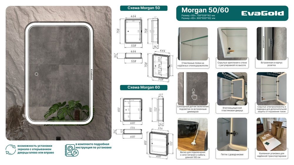 Зеркало-шкаф EvaGold Morgan 60 см EG010323 (LED-подсветка, сенсорный выключатель, диммер)
