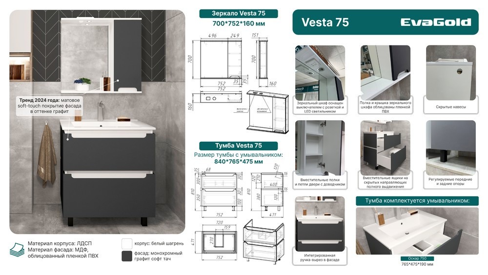Зеркало-шкаф EvaGold Vesta 75 см EG010227, графит софт тач