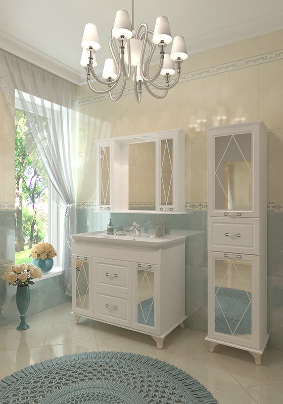 Новая классическая коллекция мебели Victoria 100 визуально расширяет пространство ванной комнаты, благодаря наличию зеркал как на дверках тумбочки и зеркального шкафа, так и на пенале. Вместительные отделения пенала позволят хранить необходимые вещи. Белое исполнение коллекции впишется в любой интерьер Вашей ванной комнаты.